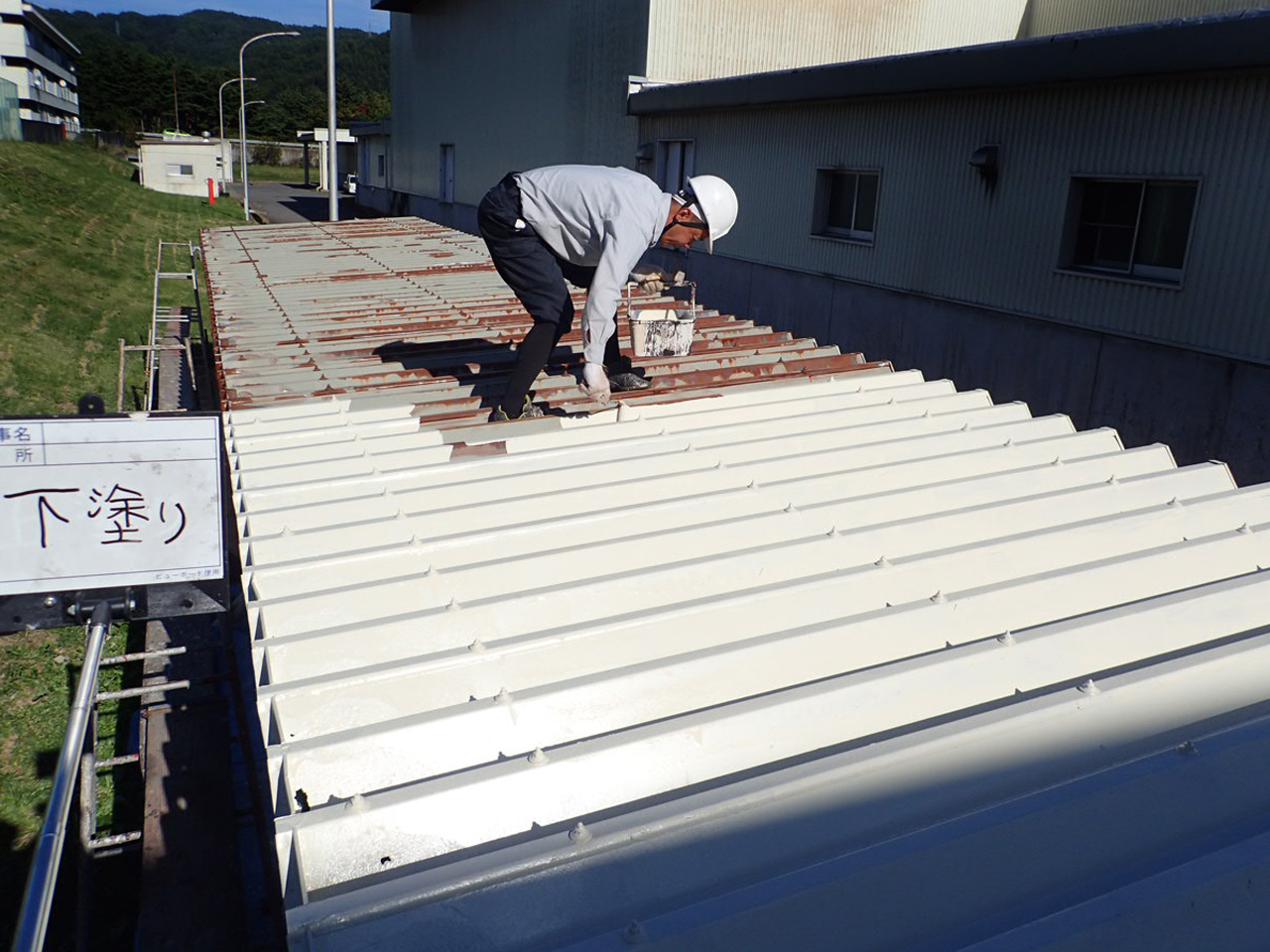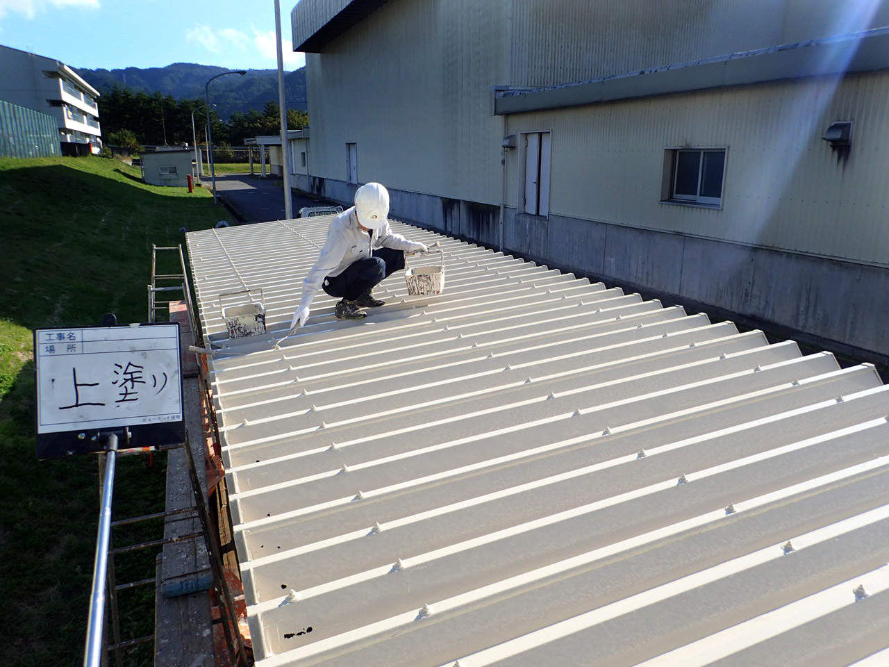 サビや旧塗膜など傷んだ部分は電動工具などで完全に除去し、腐食が激しかったので下塗りに2液型エポキシ塗料で全面に2回塗装を行ってから、2液型のトタン屋根用シリコン樹脂塗料で中・上塗り作業を行いました。